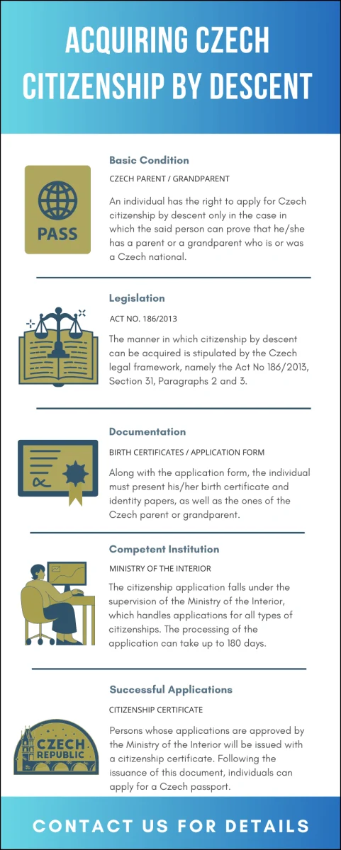 A person can obtain Czech citizenship by descent provided that he or she has a Czech heritage. The procedure is more complex, as one needs to provide enough evidence on the Czech/Czechoslovak descent. Given this, persons interested in the procedure should address our immigration lawyer in Czech Republic, who can present the main rules of law and steps to be taken in this sense.