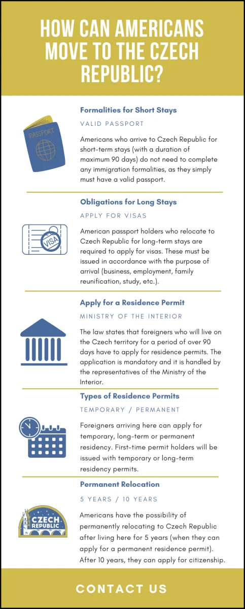 | Immigration requirements for short stays | Americans who relocate from the US to the Czech Republic do not need to meet any immigration formalities (however, they must arrive here with a valid American passport). |